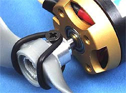 Mocowanie śmigła polega na osadzeniu go na piaście i zabezpieczeniu specjalną gumką znajdującą się zestawie (jak na zdjęciach).